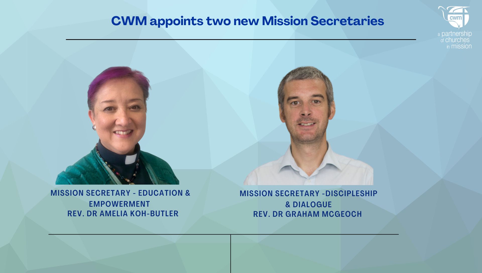 Council for World Mission (CWM) welcomes two new Mission Secretaries after the Board of Directors approved the appointments during their meeting on 10 – 11 November 2022. CWM General Secretary Rev. Dr Jooseop Keum is pleased to announce that Rev. Dr Graham McGeoch and Rev. Dr Amelia Koh-Butler are appointed as Mission Secretary – Discipleship and Dialogue, and Mission Secretary – Education and Empowerment respectively.
