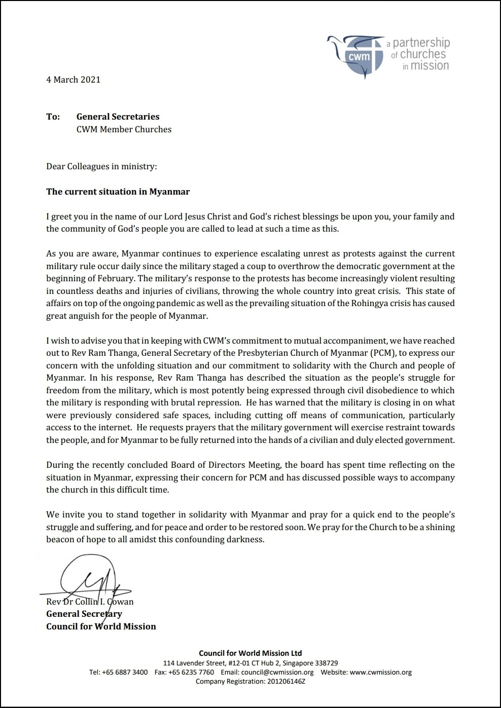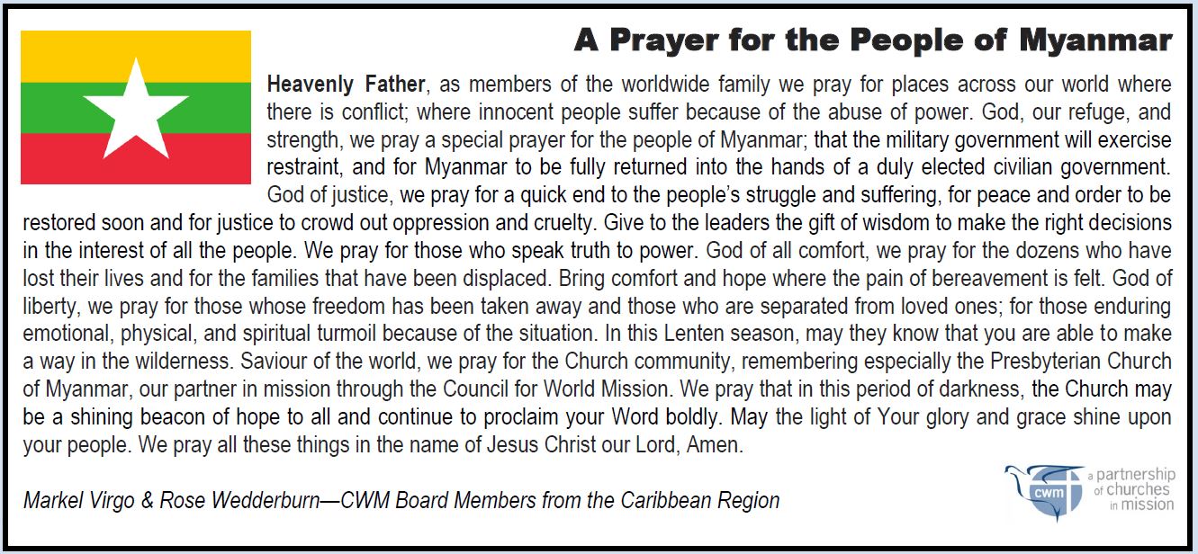 CWM General Secretary Dr Collin Cowan had reached out to PCM General Secretary Rev Ram Thanga to express deep concern and CWM’s commitment to mutual accompaniment with the Church and people of Myanmar. Rev Ram Thanga had described the situation as “the people’s struggle for freedom from the military”, requesting prayers “for the military government to exercise restraint towards the people”, and “for Myanmar to be fully returned into the hands of a civilian and duly elected government”.