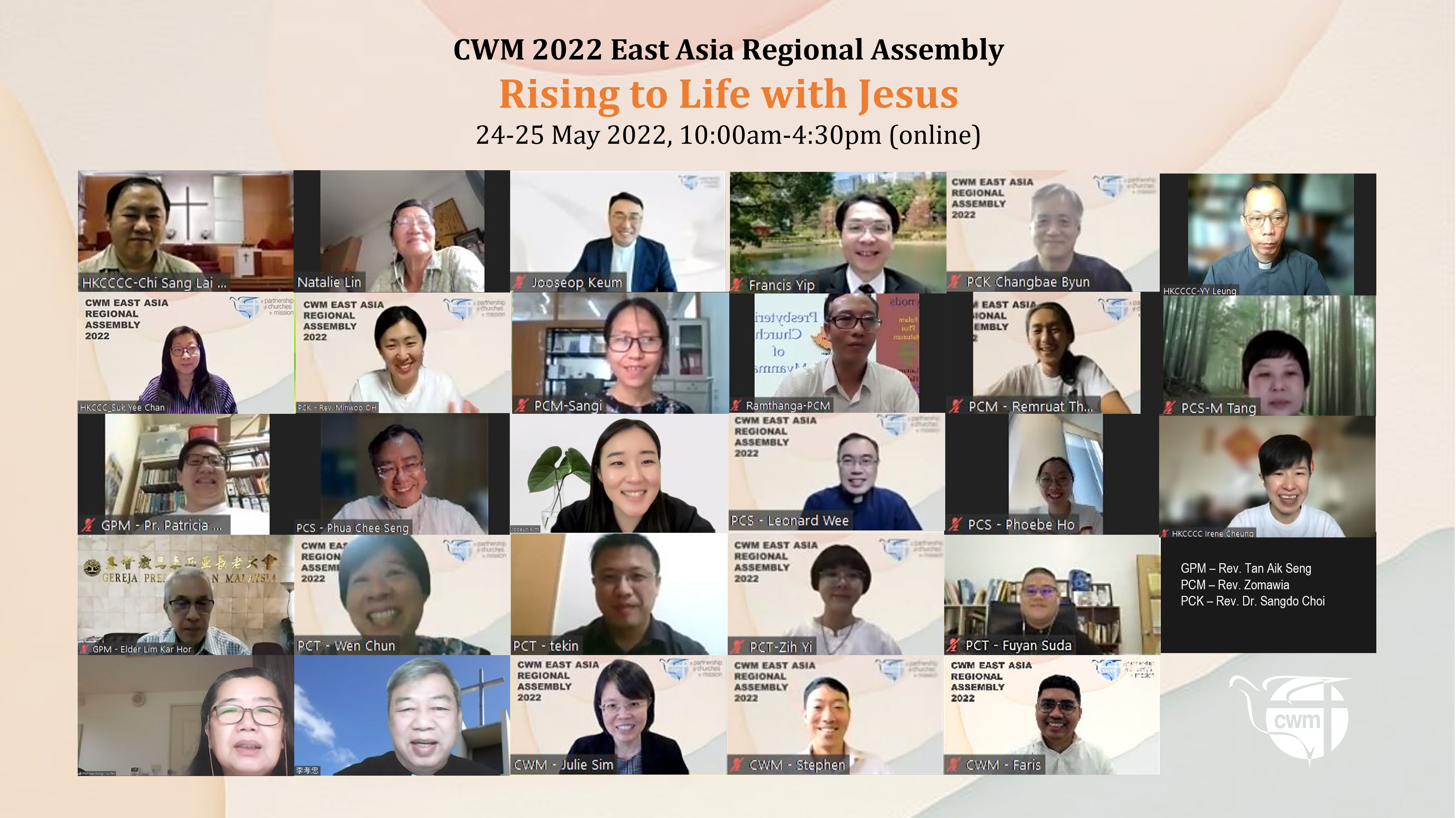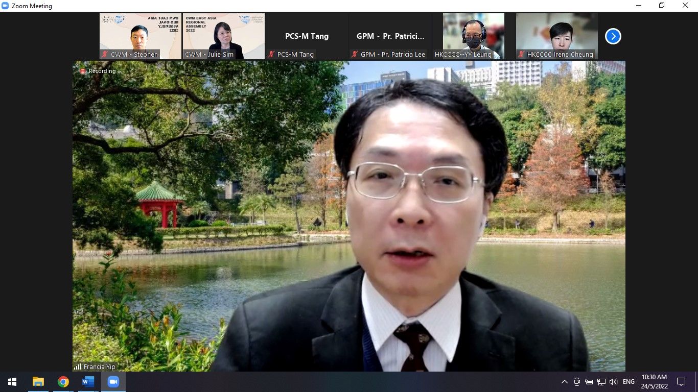 The CWM East Asia Regional Assembly was held online from 24-25 May 2022 between 10:00am to 4:30pm via Zoom to facilitate mutual sharing and collective discernment on emerging issues of the Region. Joining the meeting were delegates from the 6 East Asia member churches, the resource persons, Prof. Francis Yip, Dr Natalie Lin and CWM Partners- in-Mission (PIM) Rev. Dr Li Hau-Tiong and Mrs. Li Hsu Su-Fen.