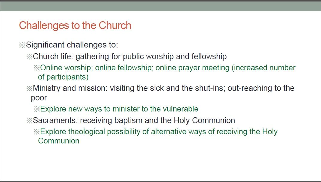 PCS began by narrating a brief history and overview of the church. Sharing its lessons learnt in pedagogy (Trinity Theological College), PCS shared the challenges of learning and utilizing zoom for online courses due to the lack of face-to-face interactions. Theologically, the issue of partaking communion remotely was brought up. An observation made was that churches became theologically flexible in light of COVID restrictions, a testament to how the global church survived the last 2,000 years. In its public witness, local congregations worked quickly to comply with pandemic restrictions. Local Christians stepped up to deliver food to migrant workers in lockdown, and assisted to set up COVID care facilities.