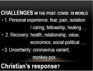 Prof. Yip examined the ministry of Jesus (quoting from Matthew and John) as a biblical response to the pandemic. Like Jesus, churches of today are still called to teach, preach, heal and exorcise. The main slant of this ministry should be the restoration of the image of the triune God, which implies a sense of dignity, community and fellowship with nature. In the economic sense, humanity should precede economic profits and gain. On the political front, we should be reminded that all the anti-pandemic measures and political policies are made for humans and not the other way round.