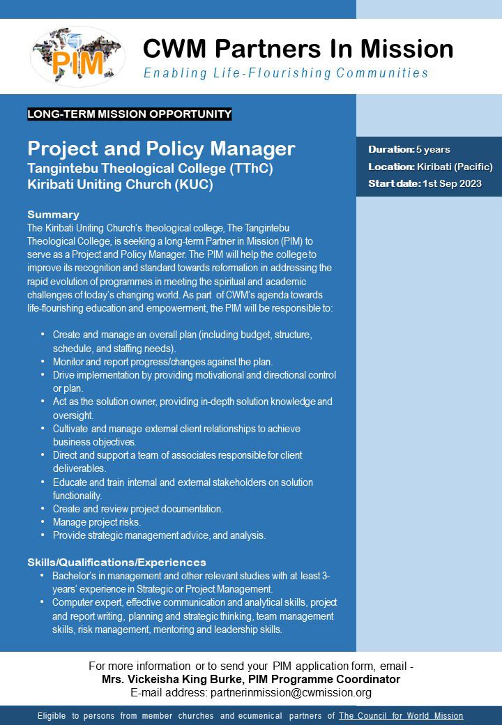 The Kiribati Uniting Church’s theological college, The Tangintebu Theological College, is seeking a long-term Partner in Mission (PIM) to serve as a Project and Policy Manager. The PIM will help the college to improve its recognition and standard towards reformation in addressing the rapid evolution of programmes in meeting the spiritual and academic challenges of today’s changing world. As part of CWM’s agenda towards life-flourishing education and empowerment, the PIM will be responsible to:
