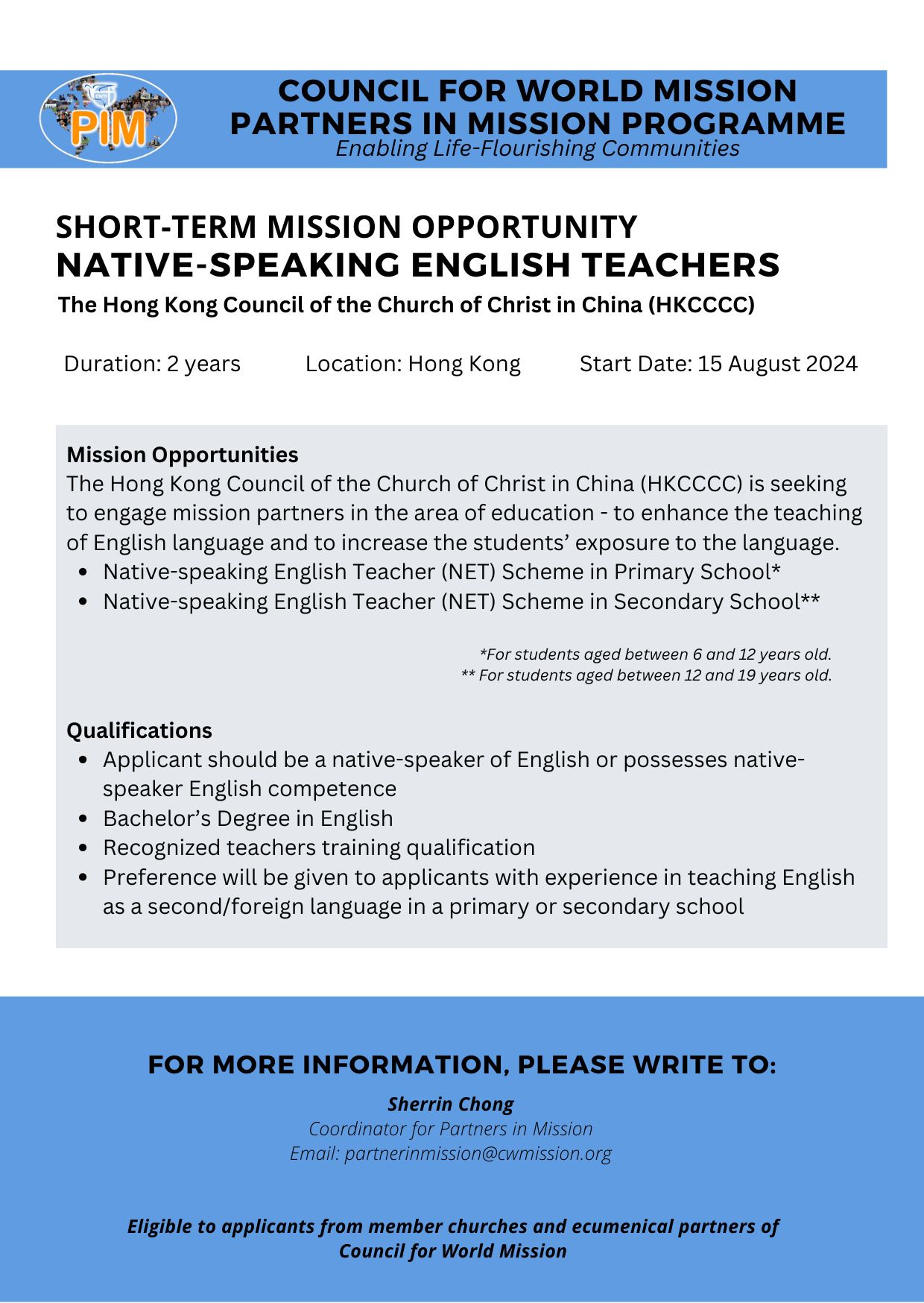 Interested applicants are to send their applications to Sherrin Chong, Coordinator for Partners in Mission, via email at partnerinmission@cwmission.org