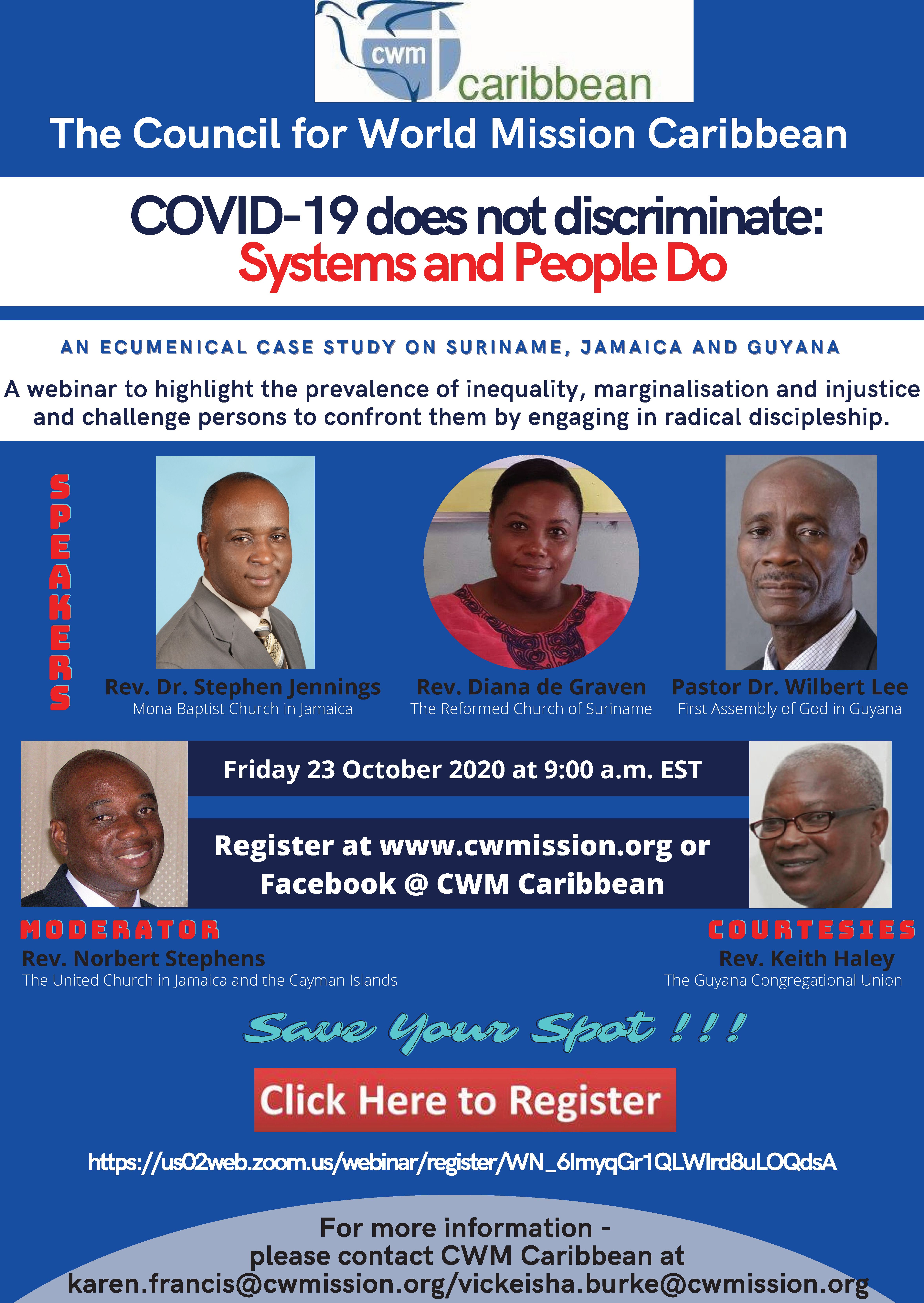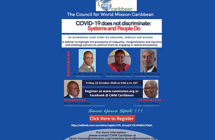CWM’s web talk series titled “COVID-19 does not discriminate: People and Systems do” is an ecumenical case study on Suriname, Jamaica and Guyana, to be held on Friday 23 October, 9am – 10:30am (EST). Organised by CWM Caribbean region, it highlights the prevalence of inequality in human interactions and discuss ways to confront marginalisation and injustice by engaging in radical discipleship.