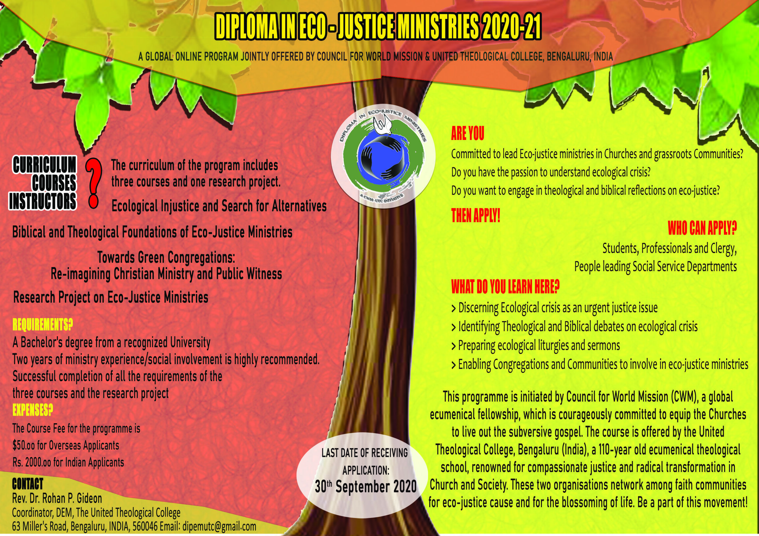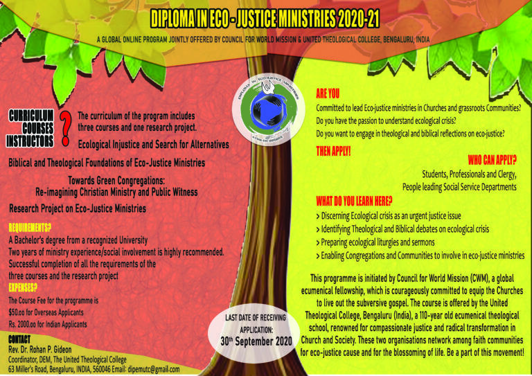 Applications are open for the Diploma in Eco-Justice Ministries 2020-2021, an online programme initiated by Council for World Mission (CWM) and offered by the United Theological College, Bengaluru, India.