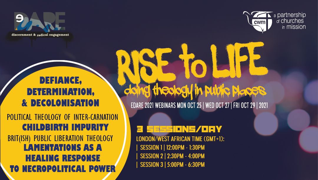 Public spaces are opportunities for rising up and talking back at abusive and colonial powers. Such opportunities are available across the Caribbean, Oceania, Africa, Asia, Americas, and Europe. Watch and pause the video clip to read the abstracts — which represent the collective of papers at eDARE 2021. Come explore ways to do theology in public spaces. Register and dare to hear this 25, 27 & 29 October.