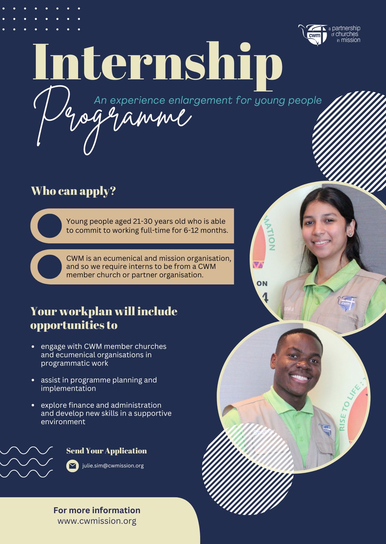 Applicants should be between 21-30 years old, able to commit to working full-time from 6-12 months. You are required to be from a CWM member church or ecumenical partner, and your application must be endorsed by your church’s General Secretary or Moderator.