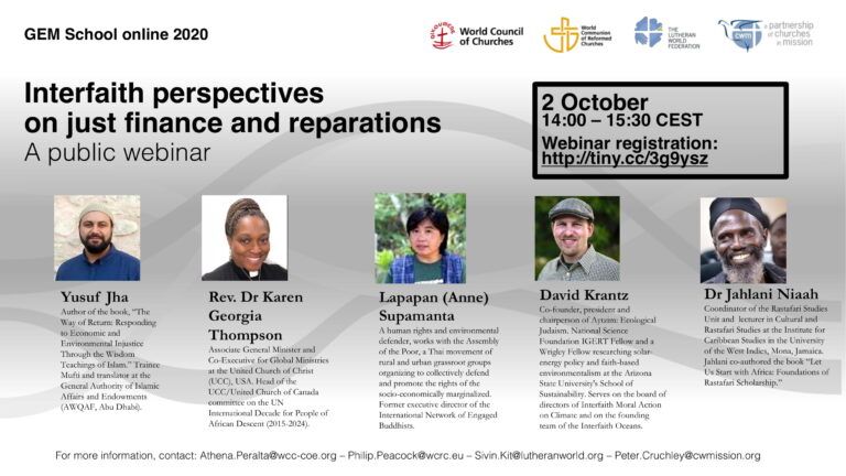 The webinar aims to address the following questions: What do our faith perspectives have to say on the issue of debt and how it is affecting the lives of millions of people around the world? How can finance and financial structures be made to align with our faith-rooted values? Can debt cancellation and reparations serve as important tools for promoting justice, sustainability and life-affirming economies?