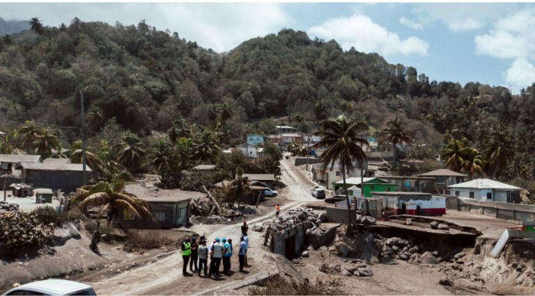 Image caption: An aerial view in the red zone impacted by the La Soufrière volcano eruption in St. Vincent and the Grenadines.
