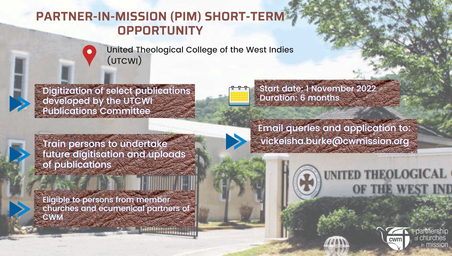 The United Theological College of the West Indies (UTCWI) is seeking a short-term Partner in Mission (PIM) to digitize select publications including its annual journal – the Caribbean Journal of Religious Studies (C.J.R.S.). The PIM will be responsible to: