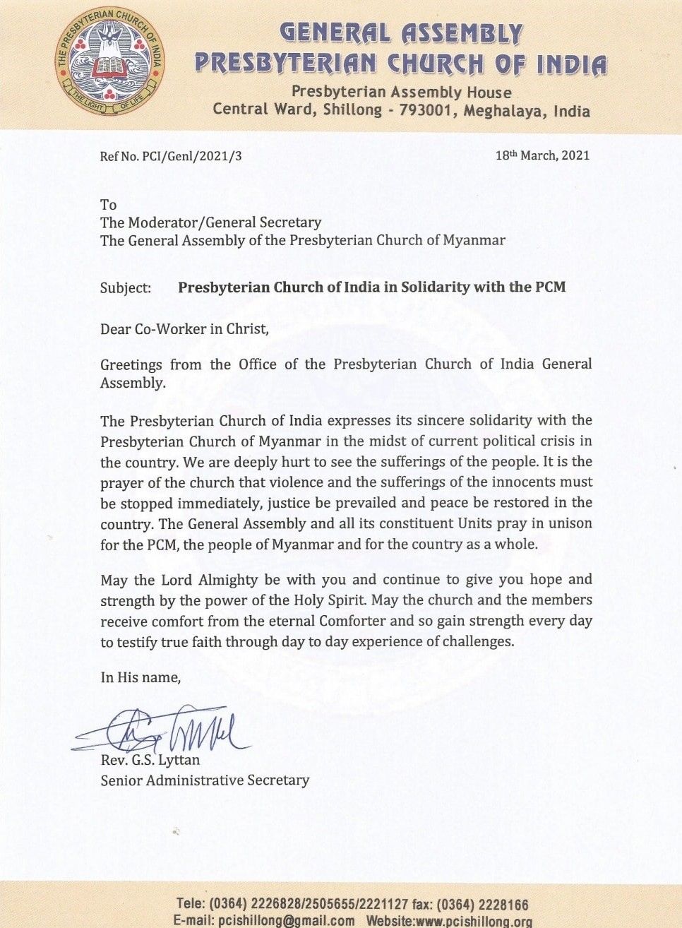 “It is the prayer of the church that violence and sufferings of the innocents must be stopped immediately, justice prevail, and peace be restored in the country,” wrote PCI Senior Administrative Secretary Rev G.S Lyttan in the statement issued by PCI.