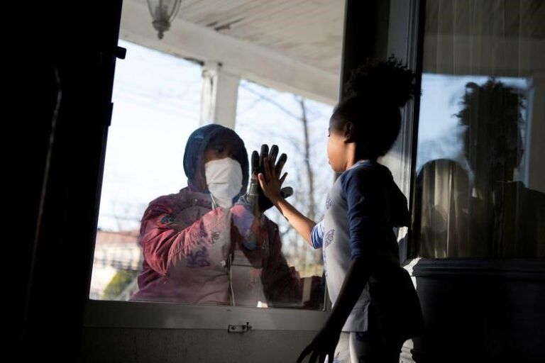 Image: Hashim, an essential worker in the healthcare industry, greets his daughter through the closed door as he maintains social distance from his family as he works amid the coronavirus outbreak in New Rochelle, New York, April 11, 2020. REUTERS/Joy Malone