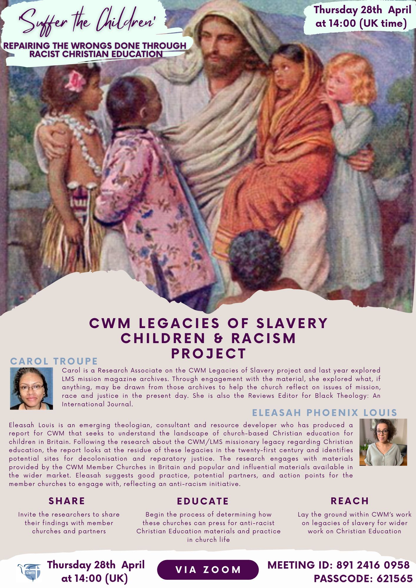 CWM is organising ‘Suffer the Children’: Repairing the wrongs done through racist Christian Education, an online meeting on 28th April, Thursday, 2:00pm UK time to share research findings on Christian Education materials with member churches and partners, conducted as part of CWM’s Legacies of Slavery (LOS) Children and Racism project. The event is part of CWM’s commitment to ‘truth-telling’ to our past, following reflections on the legacies of slavery in CWM’s life and history since 2017.
