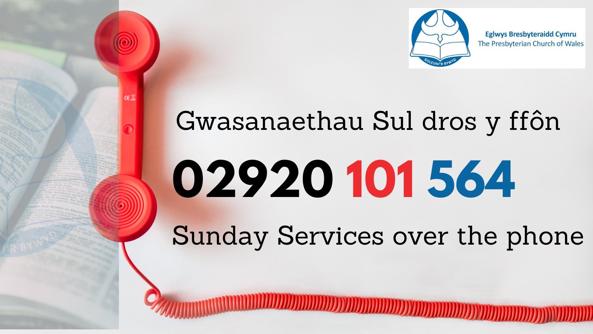 The Presbyterian Church of Wales (PCW) has set up a free telephone service for people who are not confident of using the internet. Upon dialing in, callers can opt to listen to a Welsh or an English service which includes readings, prayers, hymns and a message. The content will be updated weekly, usually on a Thursday.