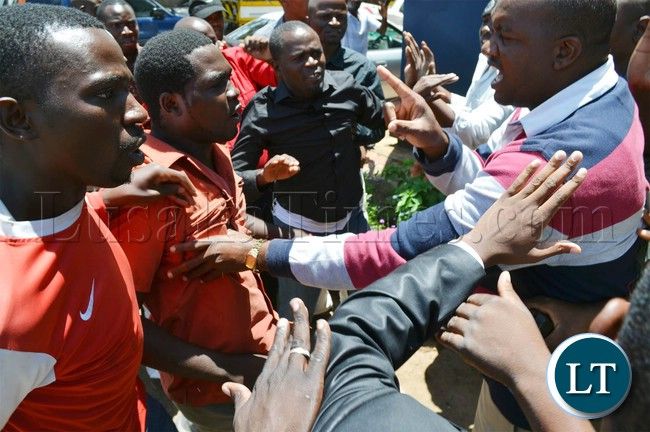 Image caption: Police officers (right) try to control suspected riotous UPND cadres at Woodlands police station in Lusaka. Credit: Lusaka Times