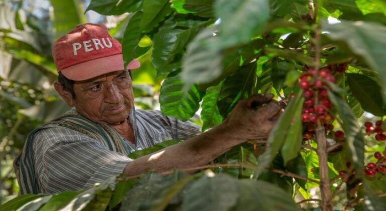Image caption: Claudio Morales Machado picking a coffee plant in San Miguel del Faique, Peru. Credit: Eduardo Martino/Fairtrade