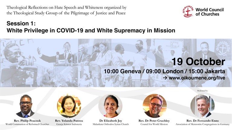 International scholars and theologians will speak on the topic “White Privilege in COVID-19 and White Supremacy in Mission” in the first of a series of webinars starting on Monday 19 October, 10.00 to 11.30 (CEST), via live-stream at www.oikoumene.org/live. To further the work of overcoming racism, two overarching themes have been identified as key areas for ongoing theological reflection – hate speech, and whiteness, and speakers will be presenting papers on these two issues.