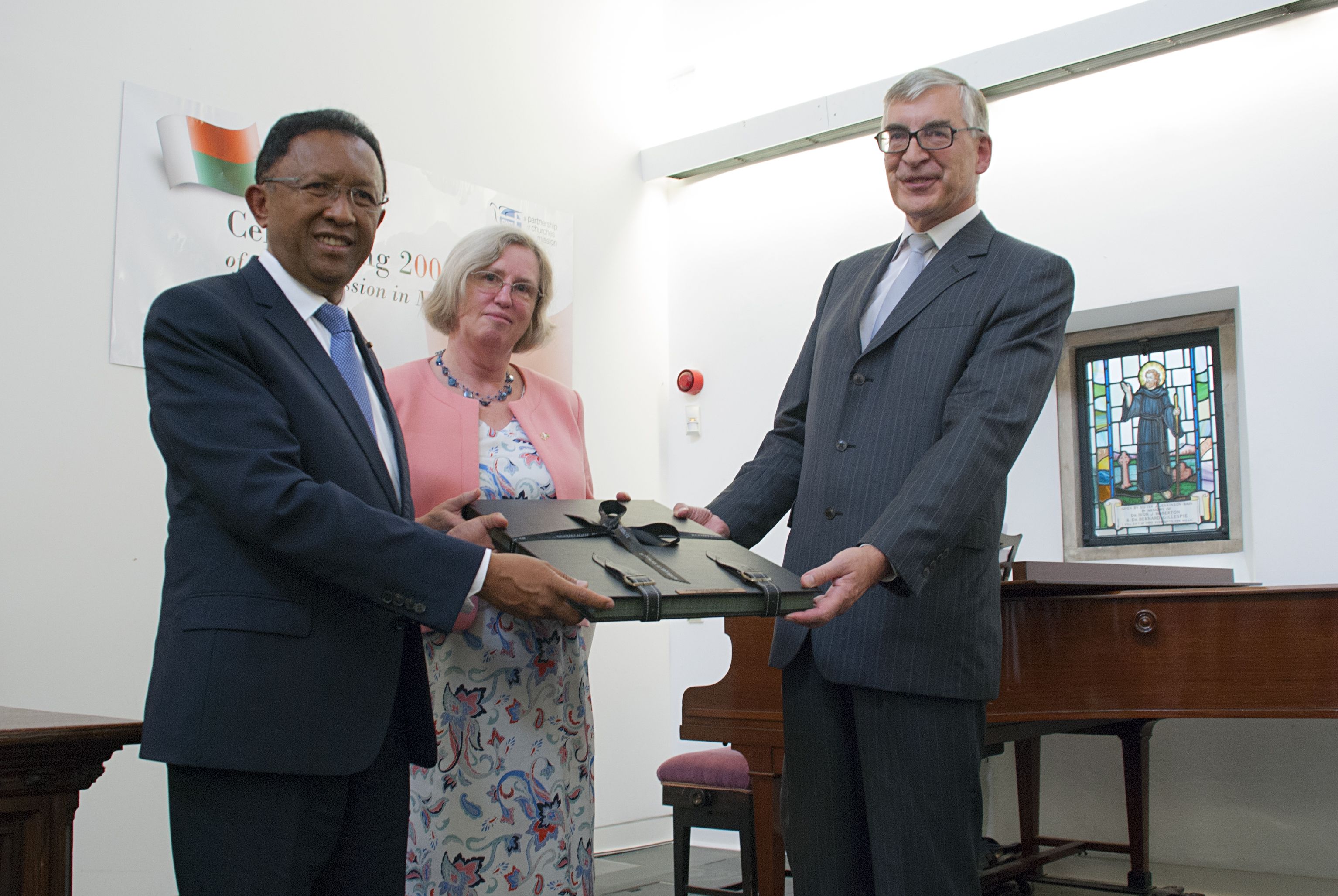 His Excellency the President of the Republic of Madagascar, Mr Hery Rajaonarimampianina (left) presenting a token of appreciation to CWM Treasurer Mr John Ellis (right), pictured with CWM Director Rev Barbara Bridges
