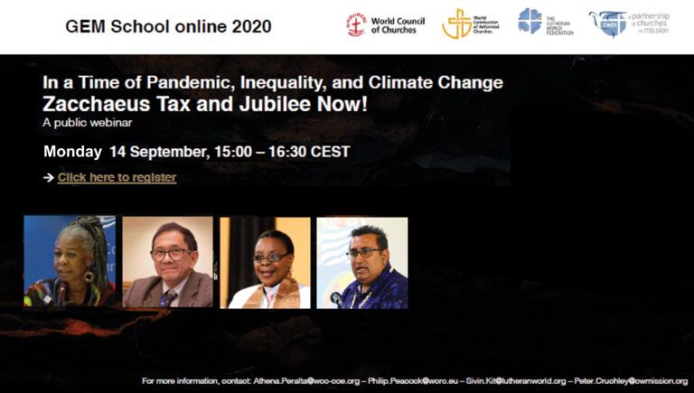 Organised as part of the 2020 Ecumenical School on Governance, Economics and Management (GEM), the webinar will offer faith-rooted and gender-just perspectives on taxation and reparations, as well as share concrete proposals as part of the ecumenical #ZacTax and Jubilee campaigns.